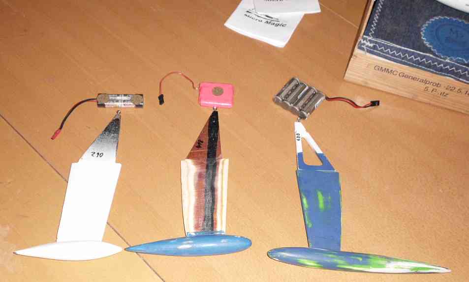 Neueste Wiegeergebnisse jeweils komplett fahrfertig mit Kiel, Akku, Haube und allem was das Boot so zum Fahren braucht: von 659g bis 1072g.