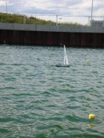 Die RTR, die ich anfangs, später Martin segelte, machte sich mit einem bausatznahen Rigg mit rMM-Bausatzsegeln recht gut, ich glaub das vorhandene kleine Kugellager oben am Mast und den Mast aus Pfeilrohr kann ich mal vernachlässigen und sagen, es war ein Bausatzrigg. Allein vor dem Wind war sie manchmal etwas langsam, aber an Kreuz lief sie gut (trotz einseitiger Delle im Kiel und trotz runder Kielkante/Ruderkante hinten usw.). Besser jedenfalls als mit den Original-RTR-Segeln und den zwischenzeitlich angeschlagenen blauen cMM-Segeln.
