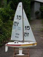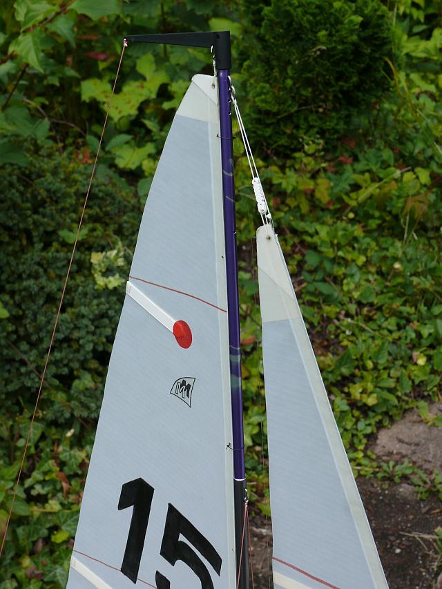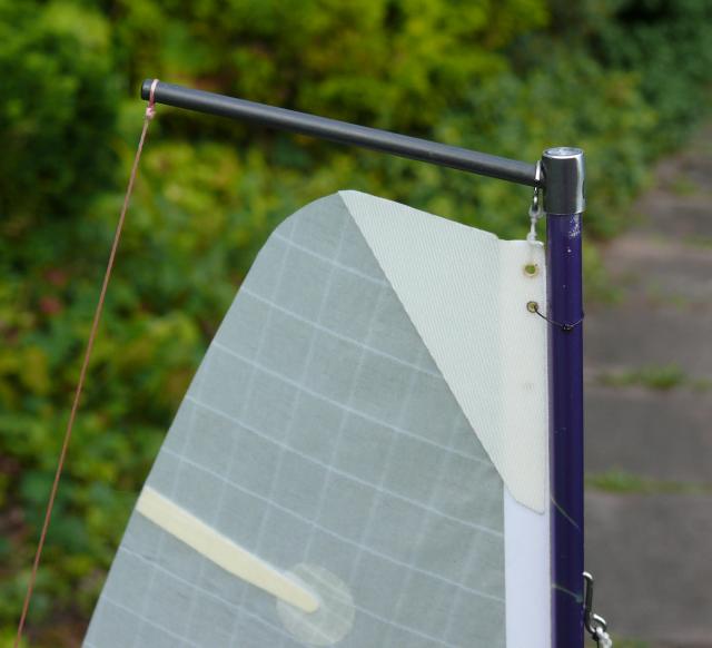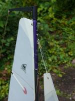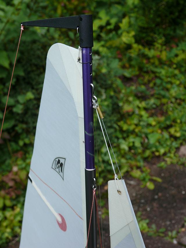 Und obwohl der Mast daraus recht weich erscheint und daher auch abnehmbare Wanten hat, deren Einsteckhaken zugleich als Fixierung des oberen Mastteils dient, hat er gestern beim Probesegeln auch ohne Wanten in Böen gut Form gehalten.